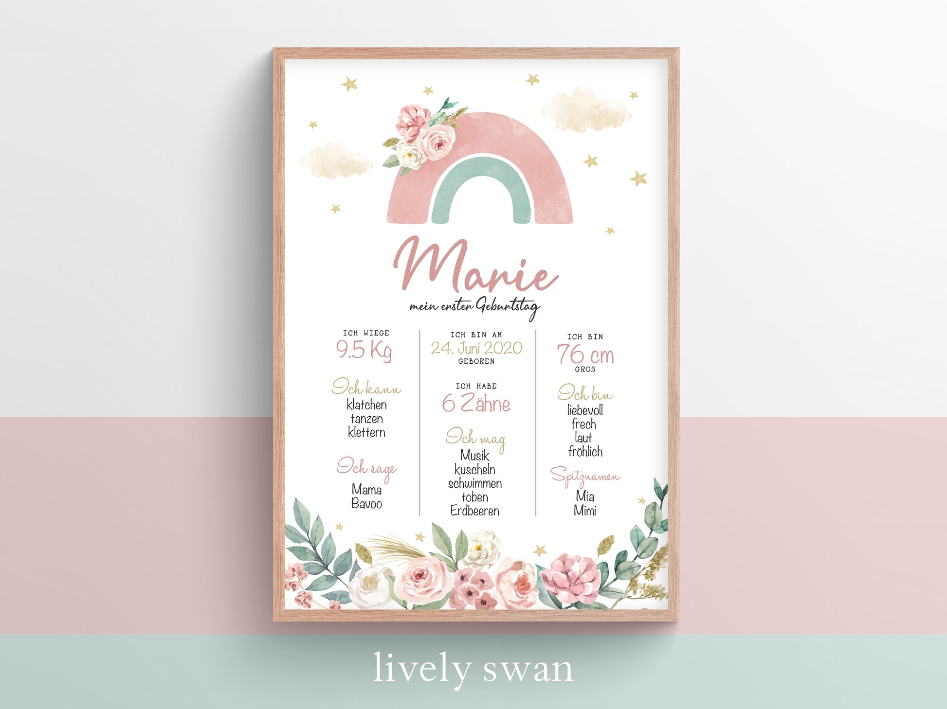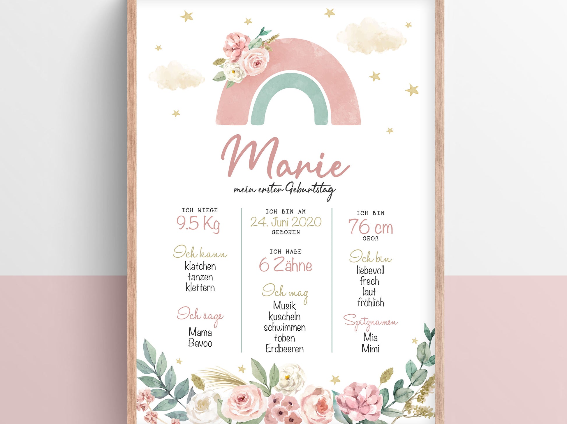 Meilensteintafel zum 1. Geburtstag, personalisiert, Regenbogen, Blumen, Geburtstagsposter 3