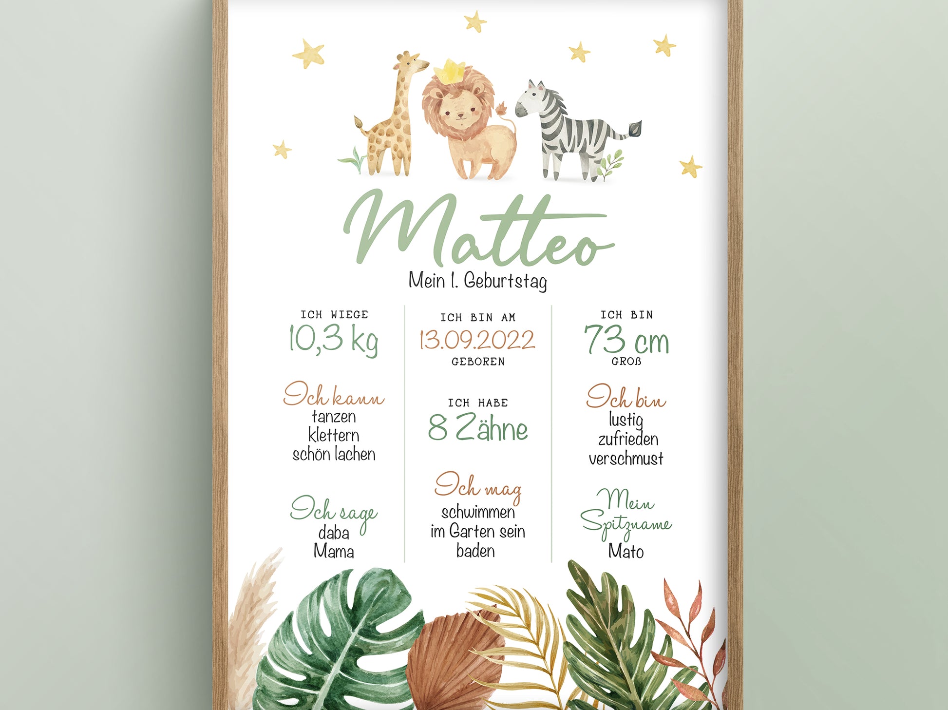 Meilensteintafel zum 1. Geburtstag, personalisiert, Safari, Geburtstagsposter
