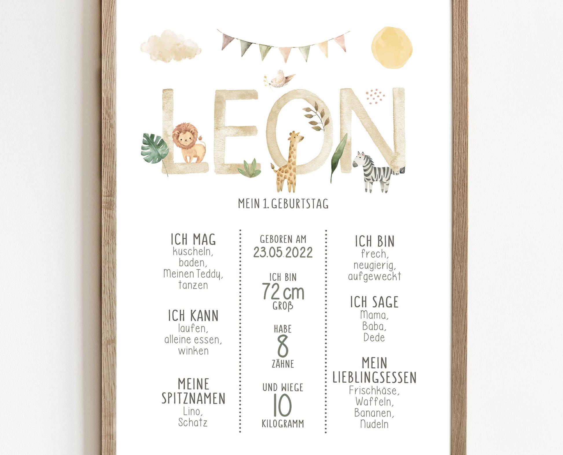 Diese personalisierte Meilensteintafel mit Safari Tieren ist ein tolles Geschenk zum 1. Geburtstag und ist eine wundervolle Erinnerung, da alle wichtigen Daten festgehalten werden.